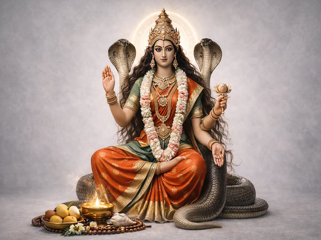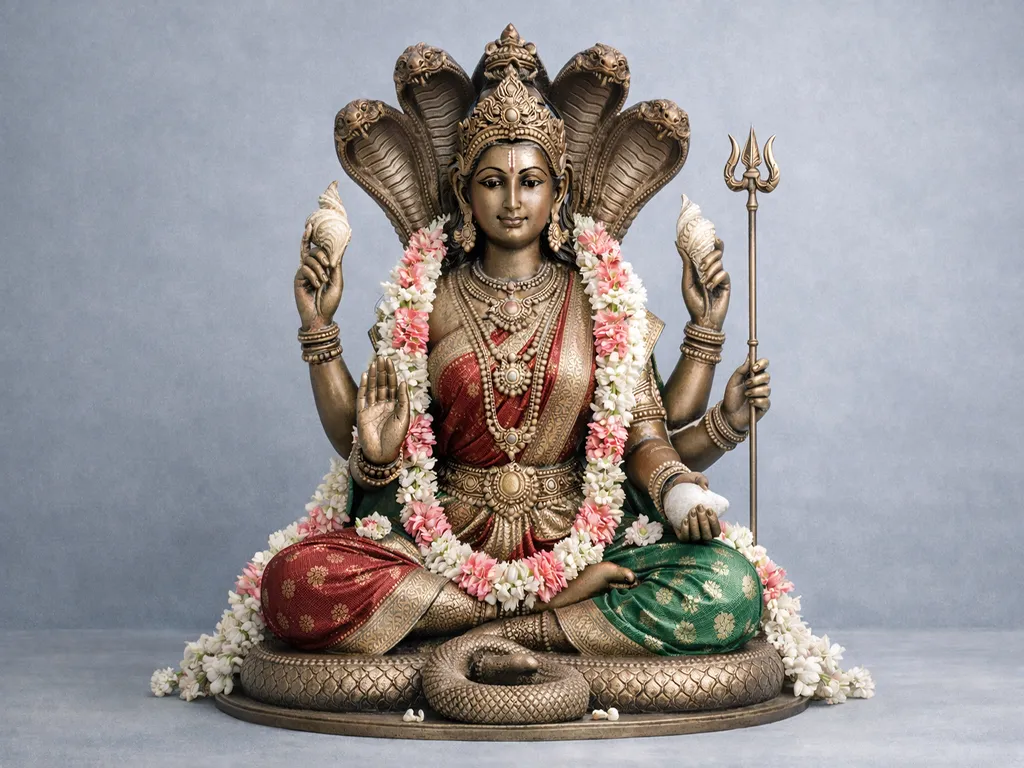 Ananta (Shesha Naga) holds the balance of time and spirit. Offer a silk thread or sandalwood paste with a steady mind. Pray for stability in transitions, spiritual discipline, or protection during uncertainty. His energy does not push; it supports, silently holding your steps when you feel the ground beneath is shifting. He anchors your path gently but fully.
