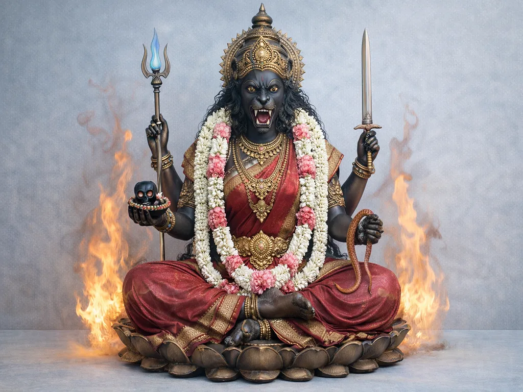 Cloaked in turmeric, guarded by flame, she silences what haunts the soul. Her presence can feel overwhelming; but never cruel. She sees what others avoid, blesses those willing to stand honest in front of her. At Brahmapuram, people don’t leave her; they carry her forward. Not as legend, but as a living force in their homes, dreams, and choices. She doesn’t visit. She stays.