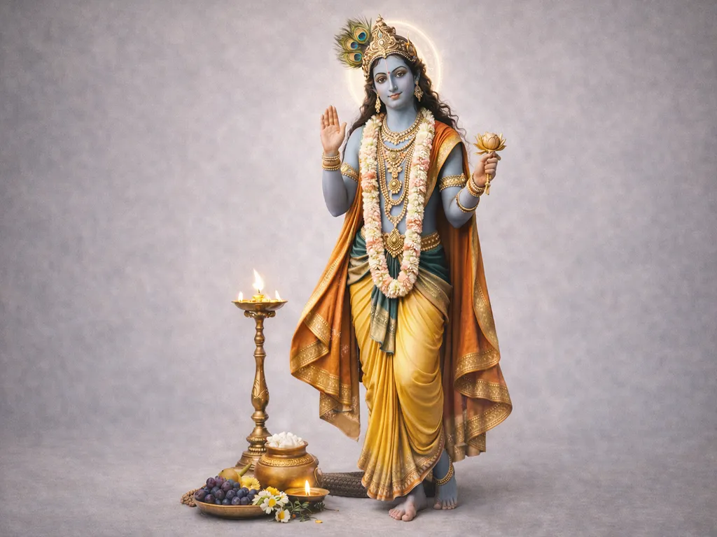To pray to Sree Krishna, offer tulsi leaves, butter, or a flute. Call his name with honesty. Sing, weep, or sit quietly; he hears all languages of longing. Ask for love that uplifts, decisions that serve truth, and the joy to stay present. He moves through melody, kindness, and humour that teaches. He frees not through escape, but through the beauty of staying fully alive.