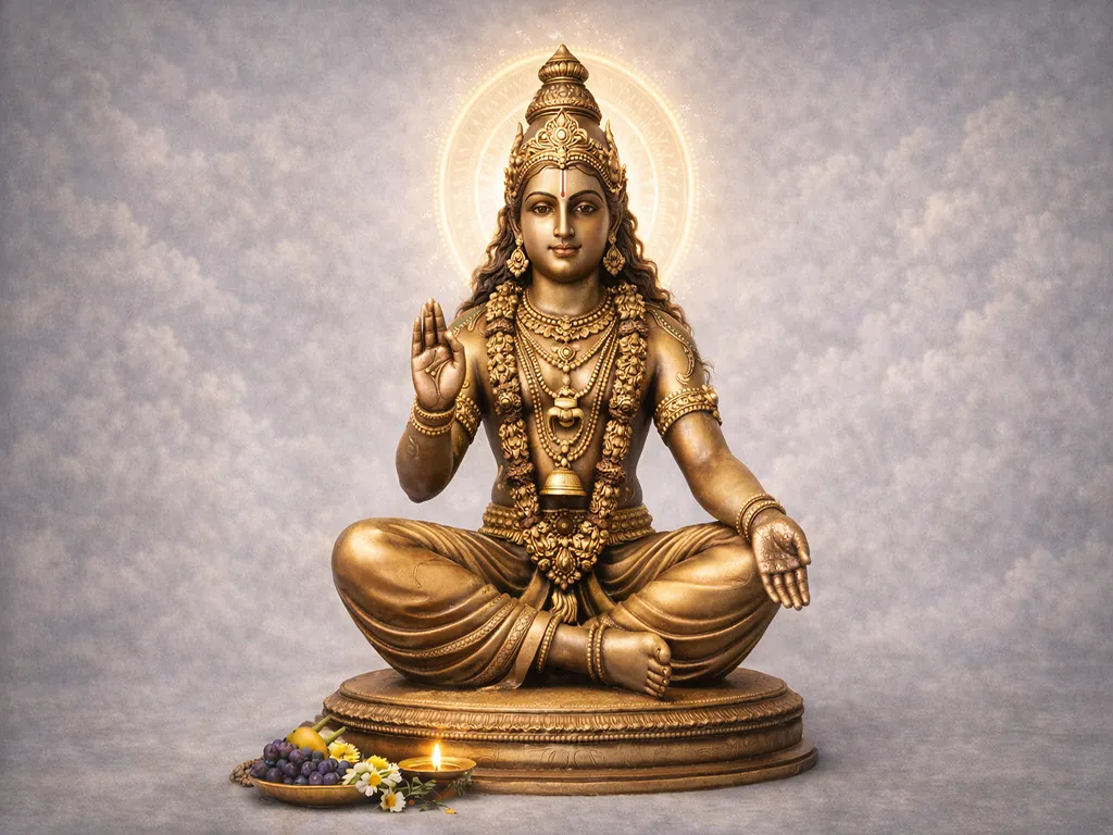 To pray to Sree Shasta, offer ghee lamps, betel leaves, or a garland of arali flowers. Stand with resolve. Speak your goal; not for approval, but for alignment. Ask for the strength to live with integrity, the patience to walk through trial, and the wisdom to keep your mind still in action. His blessing makes the householder a yogi, and the yogi a servant of life.